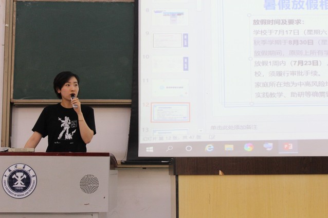 曹露晨老师介绍了关于暑假的时间安排,安排了离校和留校的注意事项,就宿舍安全和防范诈骗两个方面开展了安全教育。曹老师提醒同学们积极配合疫情防控的相关工作,按时进行今日校园信息收集和打卡任务。针对18级同学们面临的就业和升学选择,曹老师鼓励同学们做好生涯规划、提前准备,勉励准备考研并且选择暑期留校学习的同学们克服困难、努力复习。本次大会上,张瑞聪老师首次作为兼职辅导员与2018级本科生见面。他进行了自我介绍,表达了在未来一年里与同学们共同配合、共同努力的信心以及对同学们的美好祝福。