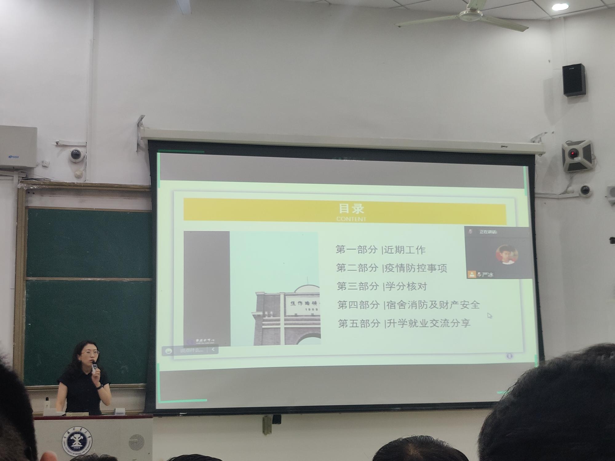 恰逢大四第一学期开学初,张菁老师首先说明了本次年级大会的主题及主要内容。她布置并说明了近期的年级工作,包括素质测评、评奖评优和建档工作的详细要求,随后进行了疫情防控注意事项的说明,并提醒同学们注意宿舍卫生和日常安全,在宿舍内严禁使用违规电器,要求同学们按时进行晚点名和日报告打卡,明确了请销假政策。接着张菁老师关于就业和升学给予了一些建议,鼓励应聘同学们提前准备好简历,主动出击;考研考公同学明确目标,调整好心态。