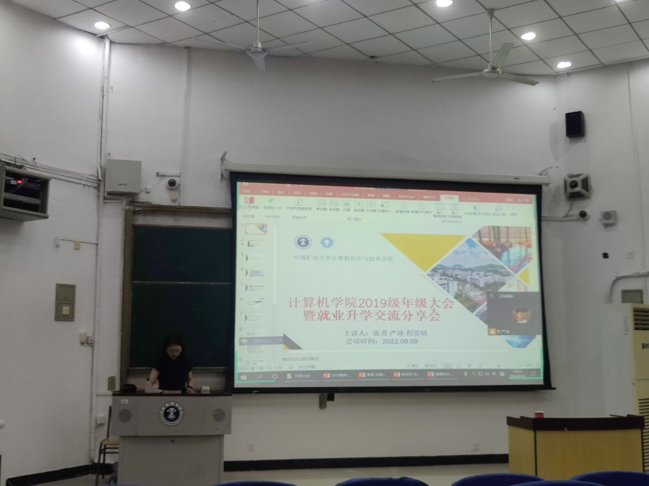 2022年9月9日下午3点,计算机学院本科生2019级在博二C102召开年级大会暨就业升学交流分享会。计算机学院2019级专职辅导员张菁老师、兼职辅导员严冰、程贵晴及2019级全体本科生参加了本次会议。本次会议由张菁老师主持。